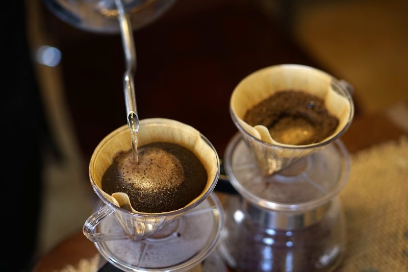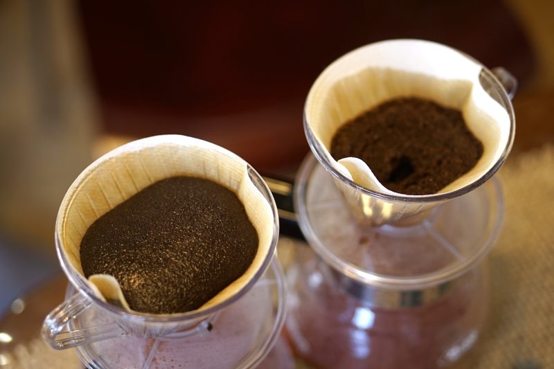 それでは実際に出来立てのコーヒーを味わいます。焙煎したばかりのコーヒー豆を挽いて、市販のコーヒー豆と一緒にペーパードリップで抽出。お湯を注ぐと、この時点で違いが歴然!焙煎したばかりの方はぷっくりと粉が膨らみ、じわりじわりと下に滴っていきます。これこそ新鮮な豆の証拠です。