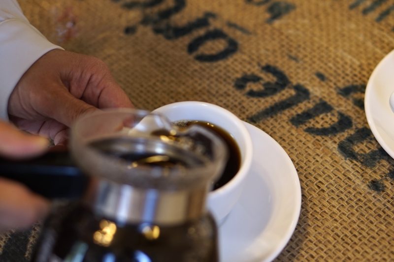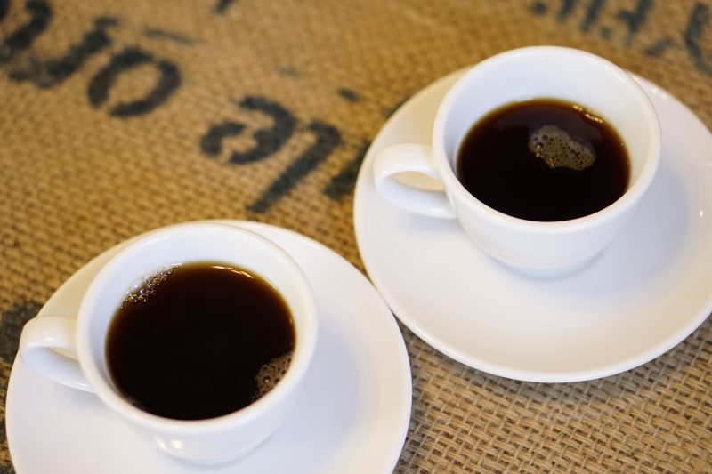 右側が市販のコーヒー、左側が先ほど焙煎したばかりの豆を使ったコーヒーです。まずは市販のものからいただきます……うん、よくランチセットの後についてくる、飲み慣れたおいしさです(当たり前)。次に、先ほど焙煎したものを一口。