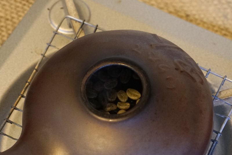 一回に使用する豆は20グラムで、コーヒー4杯分となります。これをロースターの真ん中の穴から入れて、弱火にかけながらしばし様子を見ます。