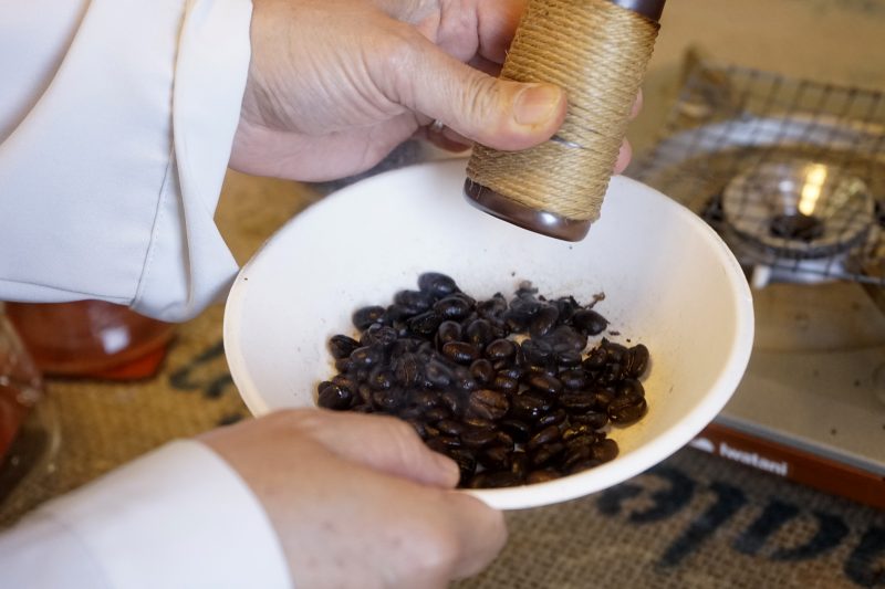 少し冷ましたところで「食べてみませんか?」と橋浦さん。コーヒー豆を食べる!?全く想像がつかないまま、一粒口に放り込みます。カリッカリっと良い歯応え。まるでスナック菓子のような食べ応えで、甘さはないですがコーヒーの風味と香ばしさ、ほのかな苦味が後を引くおいしさです。「うちの娘はよくテレビを見ながら、おやつがわりに食べていますよ」と橋浦さんは笑います。