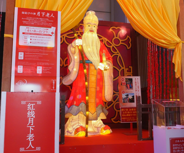 また浜ん町会場のど真ん中、浜町アーケードの「浜屋百貨店」前には、中国の縁結びの神様「月下老人」が佇んでいます。実はこの月下老人、“アジア最強”とも謳われるほど良縁吉祥にご利益のあると言われているんです!運命のふたりを小指ではなく足首で、結んでくれるそう。ランタンフェスティバル特製の赤い糸が用意されているので、ぜひ運命の人との良縁を結びましょう!