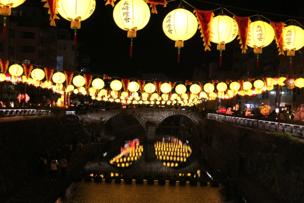 長崎では外せない観光地のひとつでもある「眼鏡橋」。眼鏡橋のある「中島川公園会場」には、黄色いランタンが飾られます。