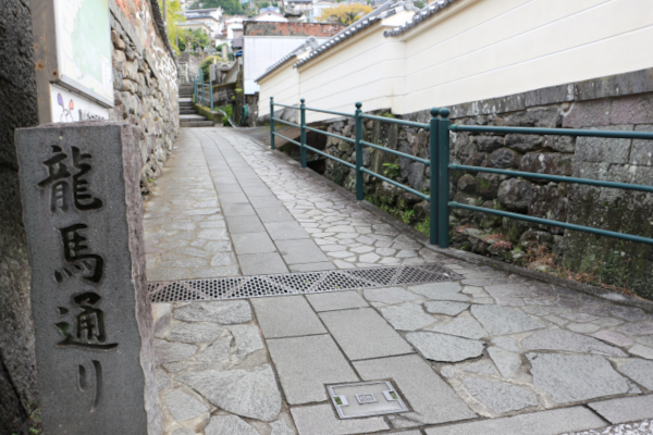 通りには、龍馬らが日本で初めて設立したカンパニー(株式会社)として有名な亀山社中の記念館や亀山社中資料展示場などの施設があります。また、龍馬像を拝める神社や公園もあり幕末ファンには心惹かれる通りです。
