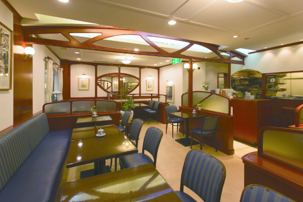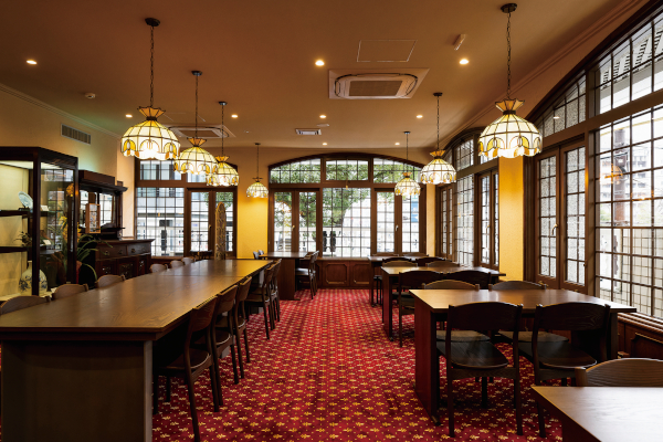 眼鏡橋から徒歩5分弱、長崎市役所そばに位置する〈松翁軒〉。もちろん、言わずと知れたカステラの元祖、創業より三百余年の歴史と伝統を持つ老舗です。その本店2階には、〈喫茶セヴィリヤ〉というゆったりとした空間が広がっています。