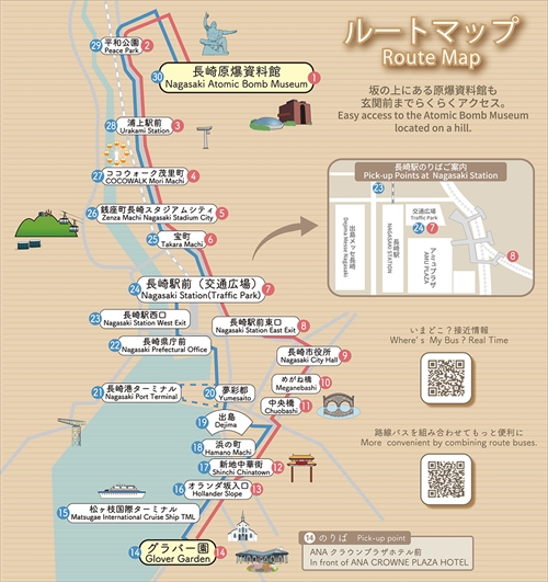 それが長崎駅からめがね橋、新地中華街、オランダ坂、グラバー園、出島、スタジアムシティ、平和公園、長崎原爆資料館をすべて回る「ながさき観光ルートバス」なのです。