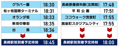 長崎駅方面の最終便出発時刻は次の通りです。以降は近くを通る市内路線バスをご利用ください。(20時ごろまで少なくとも10分に一本程度運行されています。)