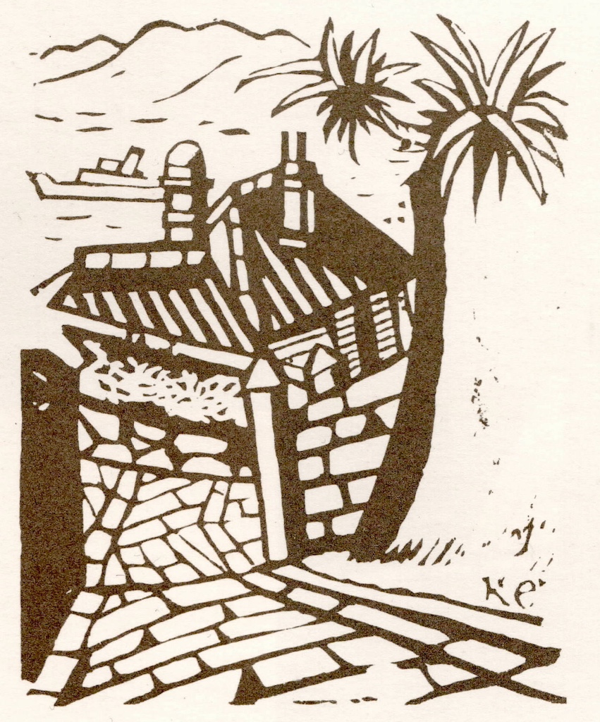 この画は十二年前(一九五三年)のスケッチである。十年一昔というが、十年を境として都市の景観はこうも一変するものかと驚いてしまう。長崎の場合は特にそれがひどいように思われる。場所は大浦川の電車道。中央のやつれた木造洋館は、そのかみの栄華を誇ったカイダ・ホテル、左手の三階建は沢山商会で、橋は弁天橋である。……今後この風景も、私の版画の中だけに生きてゆくのであろうか。(「うらぶれた居留地」)