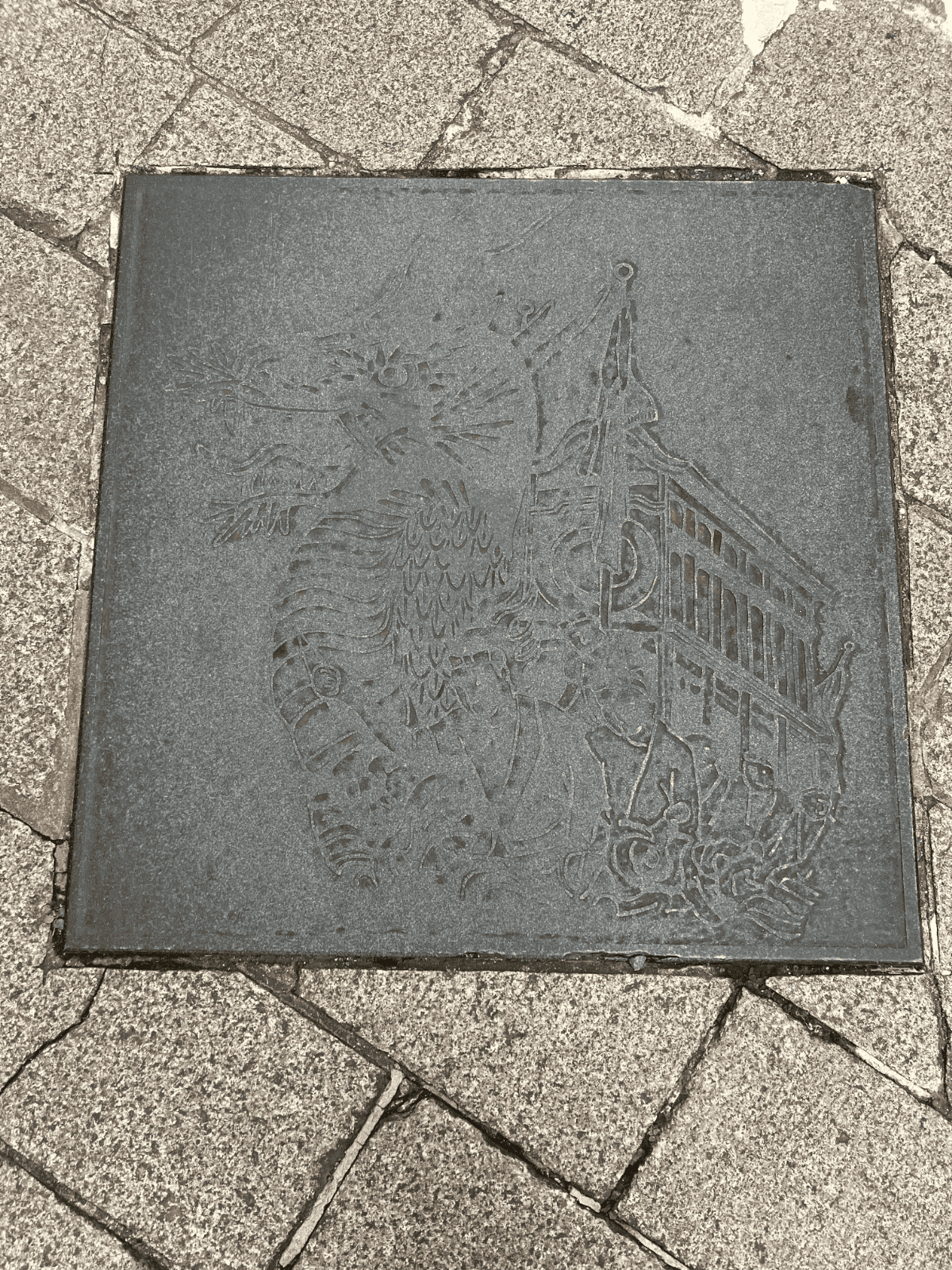 西浜町の奉納踊りである「龍船(じゃぶね)」です。呈上札に使われたこの作品は、西浜通りのマンホールにもデザインされています。