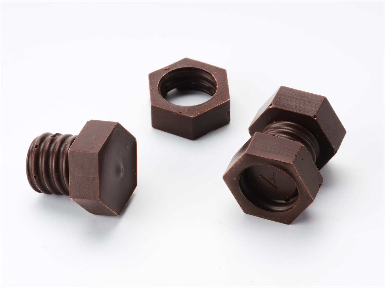カカオ50%のスイートチョコを使用して、何と3Dプリンターで作られています。ネジを回すと本当にぴったりハマります!