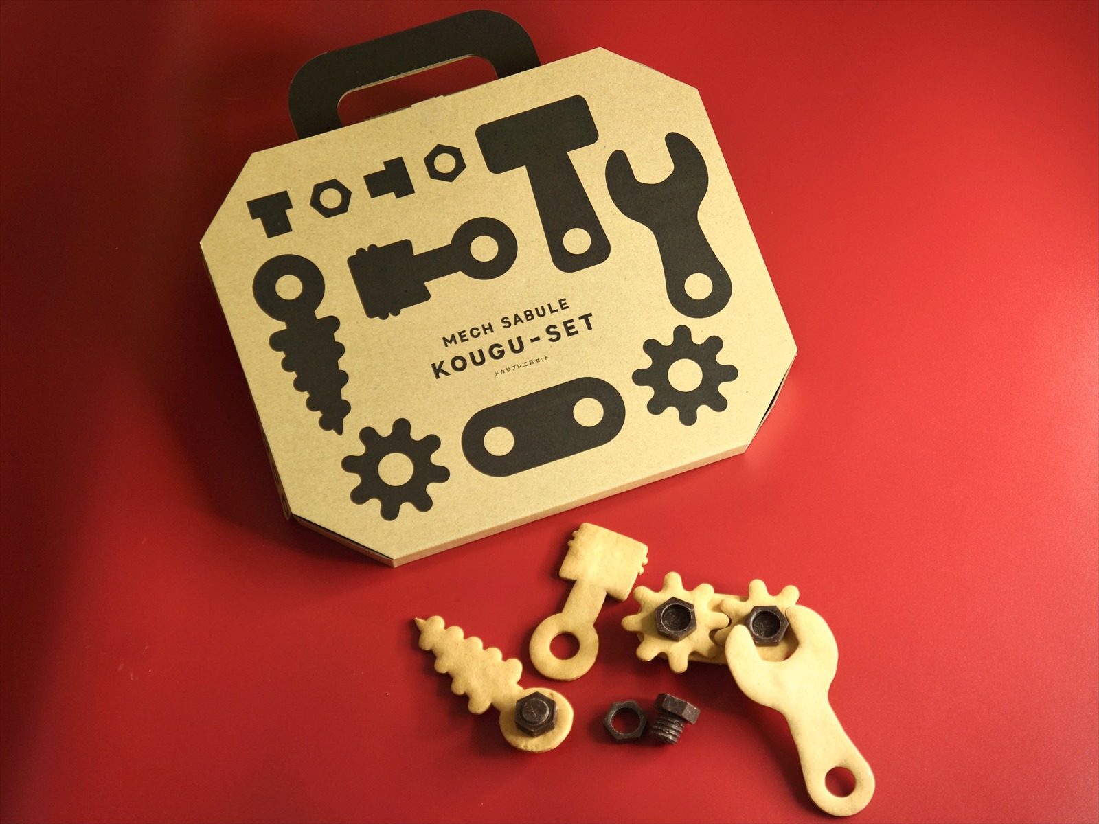 さらにすごいのが「メカサブレ」。ネジチョコとサブレを組み合わせ、おいしさだけでなく「動き」まで楽しめます。工具セットの他、飛行機セット、新幹線セット(各1,512円)があり、大人も子どもも夢中になれます。