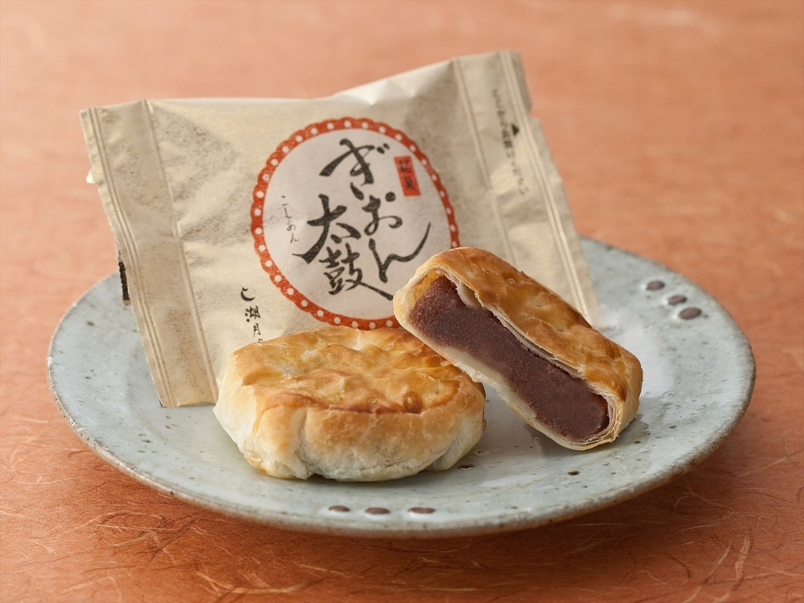 若い人にもファンが多い「ぎおん太鼓」。名前は「太鼓の祇園」で有名な小倉祇園祭りから。良質な発酵バターを使ったパイ生地とこだわりの餡が織りなす、上品な和と洋のハーモニーがたまりません。1つ184円