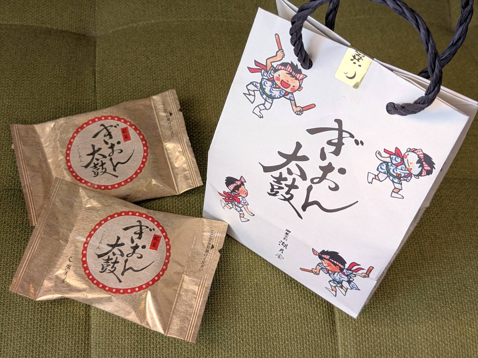 小倉井筒屋やスーパーなどで販売しているほか、土産物店でよく見かける「ぎおん太鼓」の5個入り紙袋 (1,080円)。祭りの子どもたちの楽しそうな姿が描かれ、渡すときにも便利な手提げなので、おすすめです。