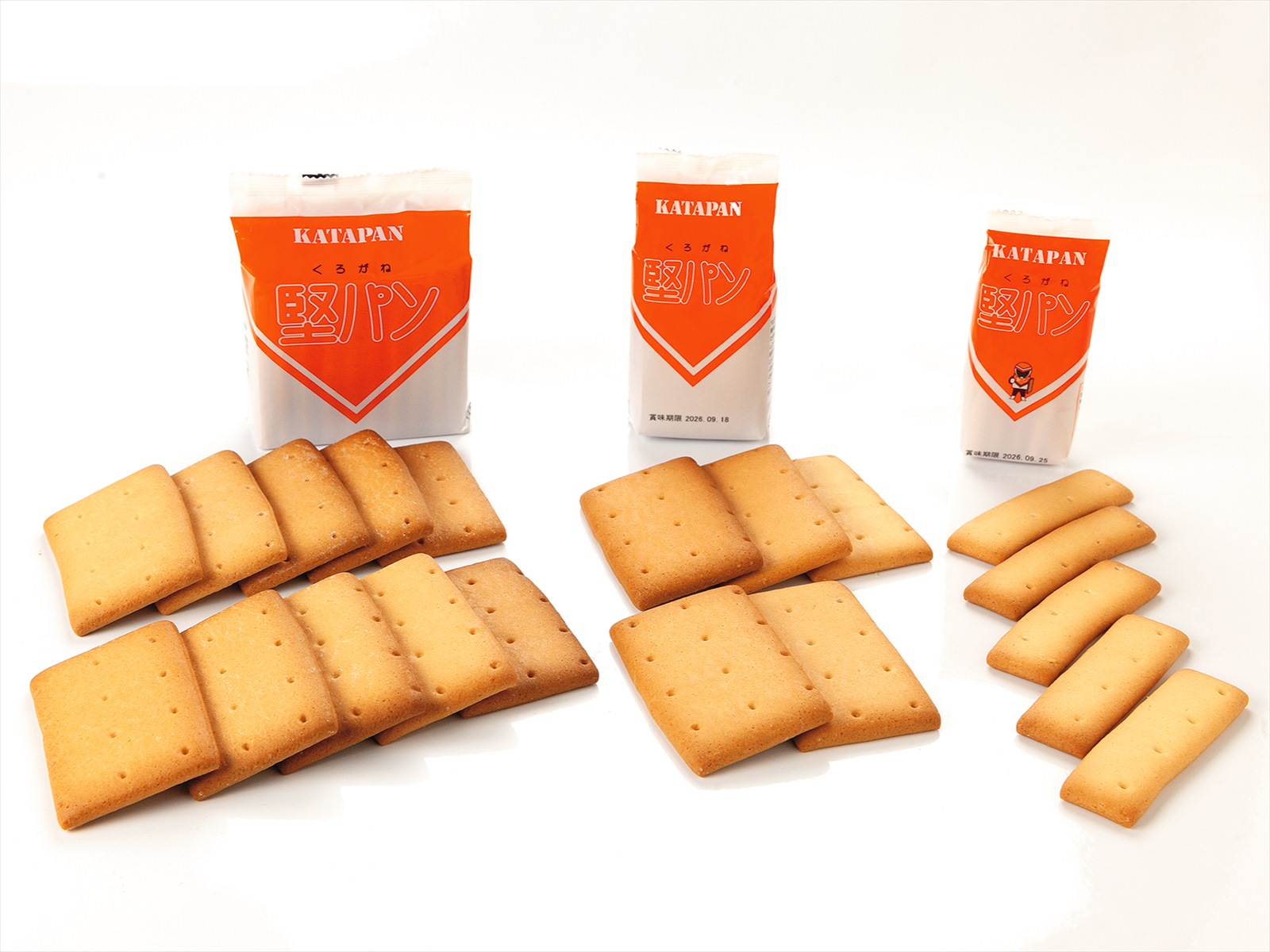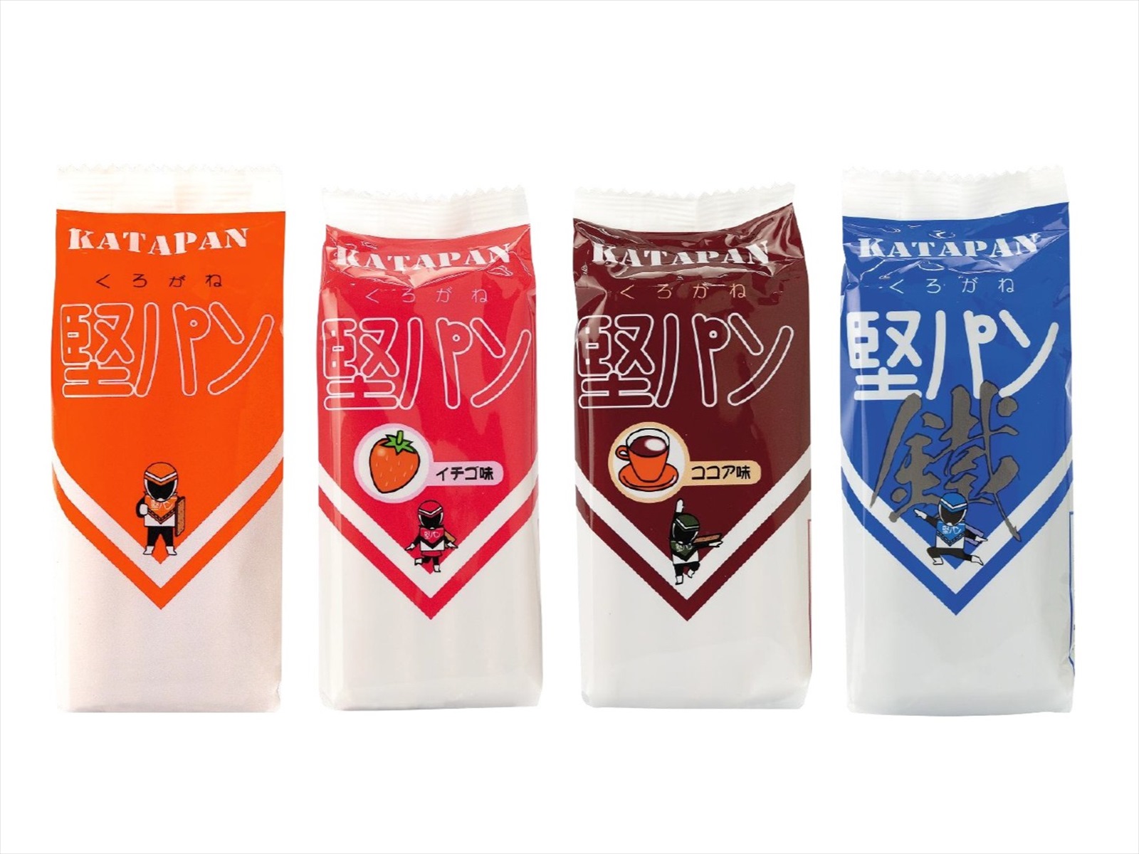 通常サイズと食べやすいスティックタイプ、プレーン味からいちご味、ココア味、黒い堅パン「鐡」など種類豊富。