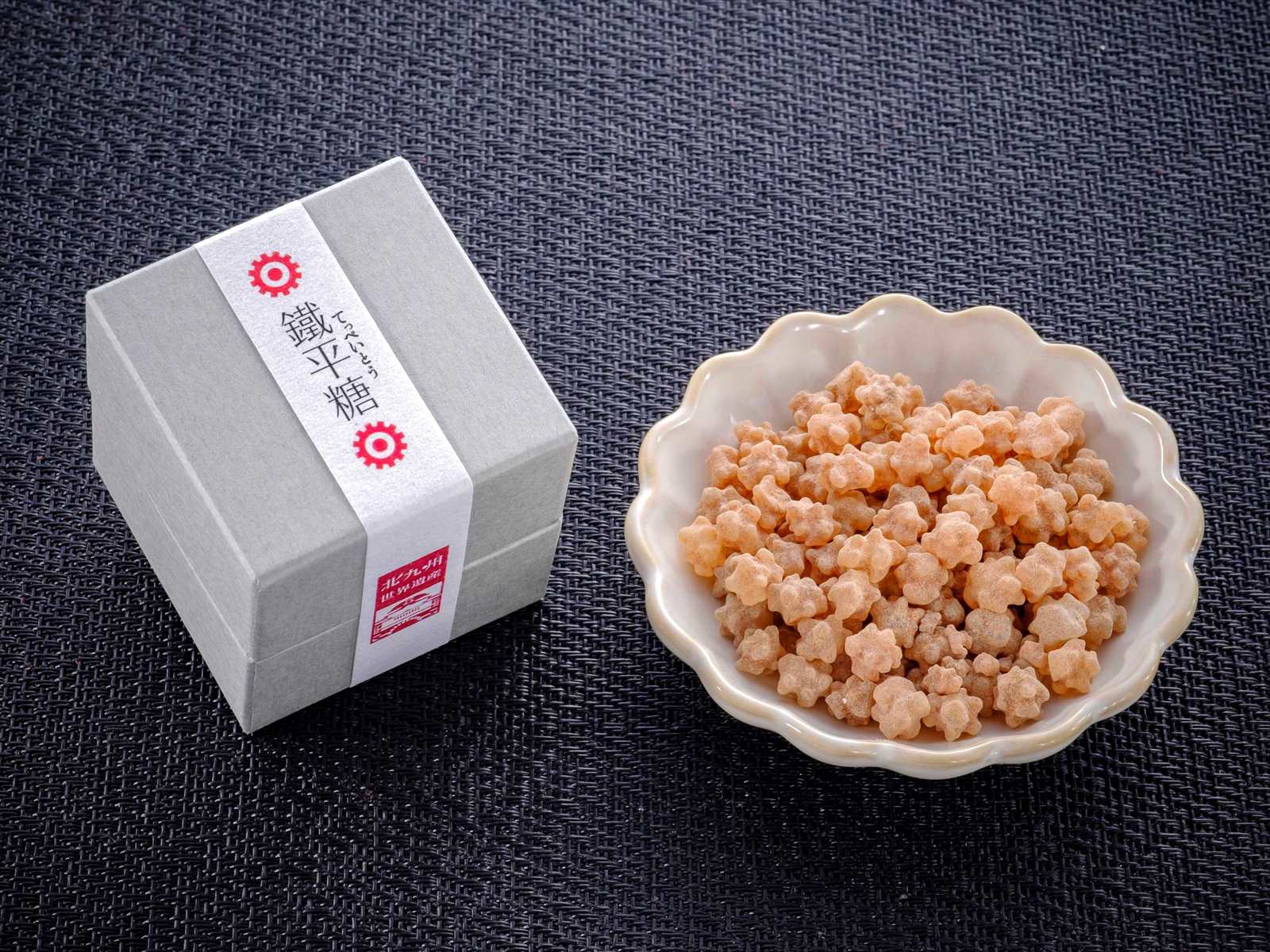 2015年に「官営八幡製鐵所関連施設」が世界文化遺産登録されたのをきっかけに開発された、“鉄のまち”の金平糖「鐵平糖」。八幡東区にある千草ホテルと、帆柱山の麓で創業した入江製菓の共同開発によるオリジナル商品です。少し錆びた風合いで、その名の通り「鉄の味」!1箱540円。