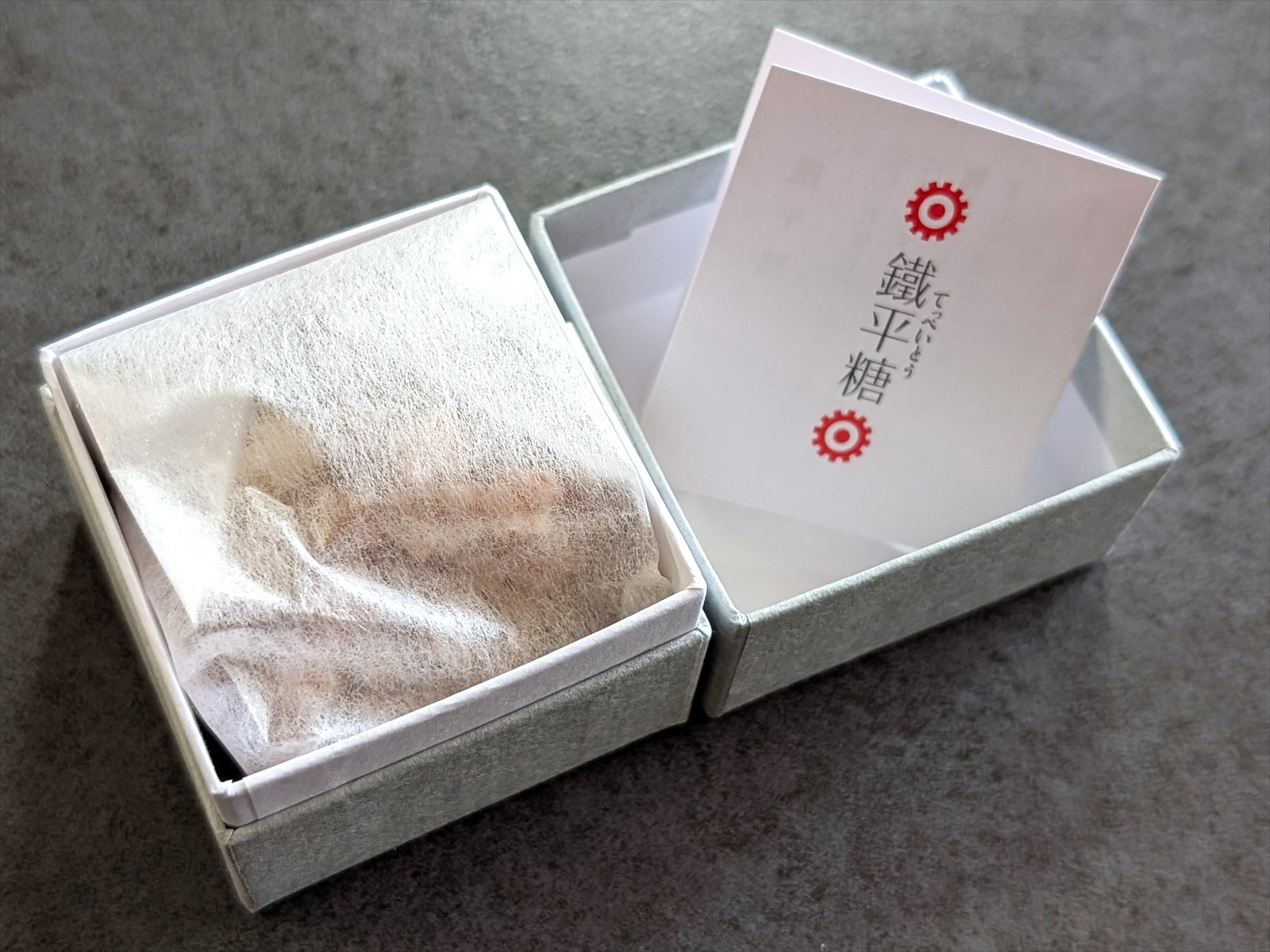 製鉄所とともに歩んできた八幡のまちを象徴する鉄の色をイメージした和紙箱を開けると、おしゃれに包装された鐵平糖と小さな説明書き。