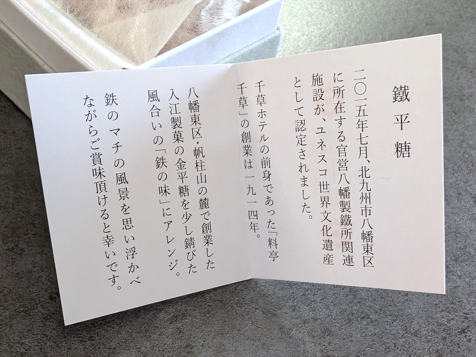 鐵平糖に関する話と、最後に「鉄のマチの風景を思い浮かべながらご賞味頂けると幸いです。」というメッセージが綴られています。ロマンがありますね~。