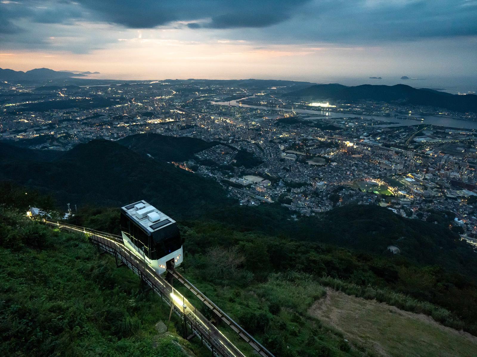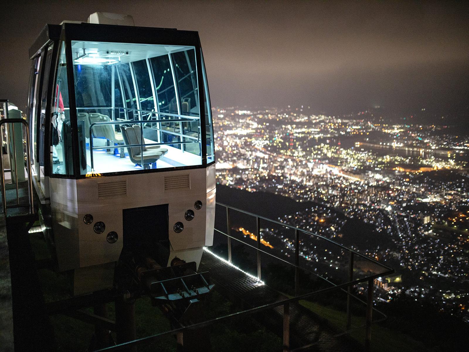 山頂の展望台までは、ケーブルカーとスロープカーを乗り継いで向かいます。到着まで10分ほどですが、全面ガラス張りの車窓から次第に夜景が見え始めると、テンションは急上昇!スキーのジャンプ台とほぼ同じという、最大傾斜28度の急勾配を上り下りするドキドキ感もたまりません。