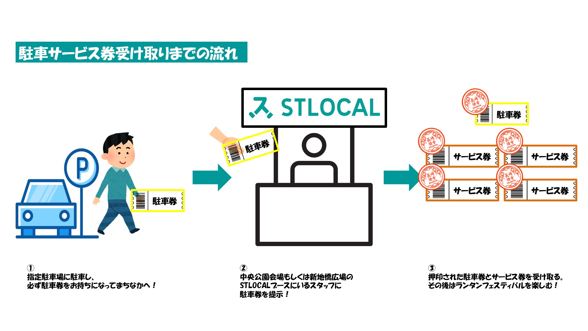 中央橋会場または新地橋広場のSTLOCALブースにて、スタッフに駐車券を提示。