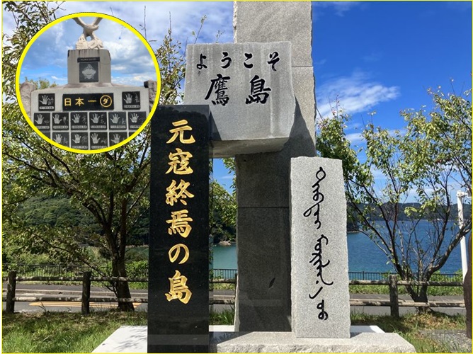 最後に訪れるのは、鷹島の最北端にある「モンゴル村」。風を感じる草原が広がるモンゴル村には、福岡ソフトバンクホークスのモニュメントも・・。勝利をつかむ「勝鷹」、攻めの「攻鷹」、守りの「守鷹」の3羽の鷹と台座からなり、中央の台座には福岡ソフトバンクホークス王貞治会長が揮毫した「必勝」の文字が刻まれています。