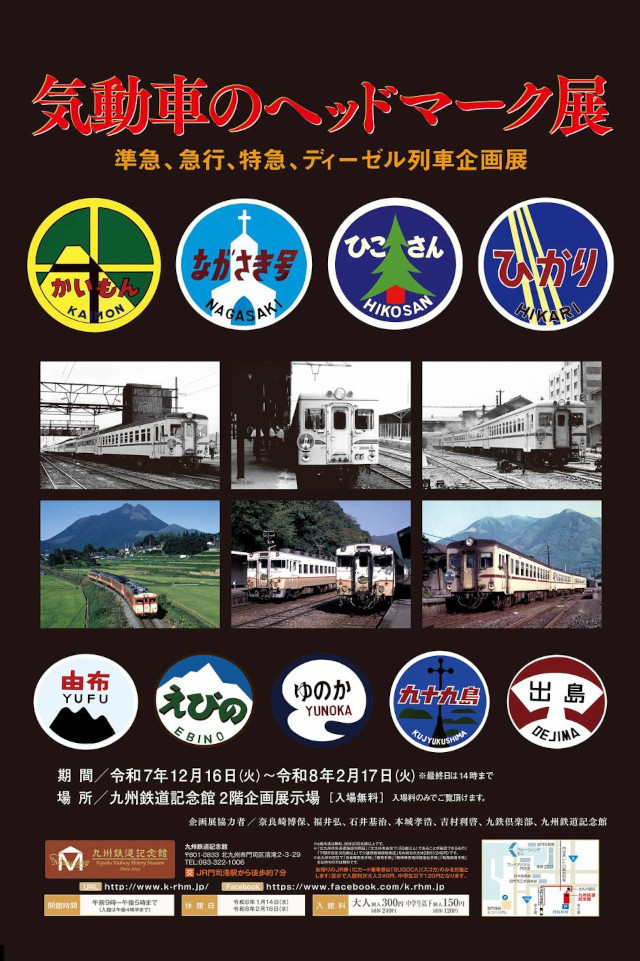 準急、急行、特急、ディーゼル列車企画展。日本中が高度成長期と言われる大きく豊かに成長する時代に、九州の都市と地方を結び、大量の人移送を担った準急などのディーゼル列車を地域色豊かなデザインで彩ってきた「ヘッドマーク」。その貴重なヘッドマークの数々と写真資料約100点をご紹介します。