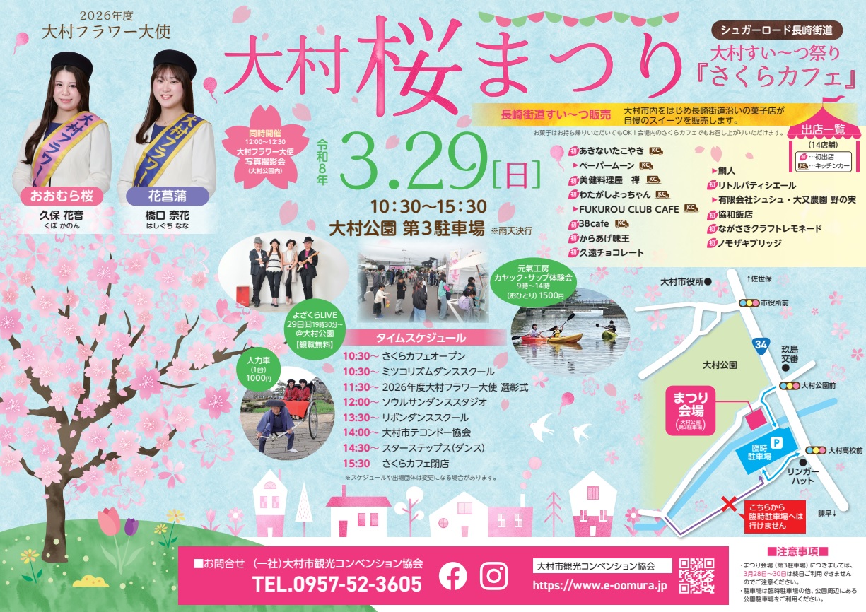 「日本さくら名所100選」の地である大村公園で、大村桜まつり「シュガーロード長崎街道大村すい~つ祭り『さくらカフェ』」が開催されます。