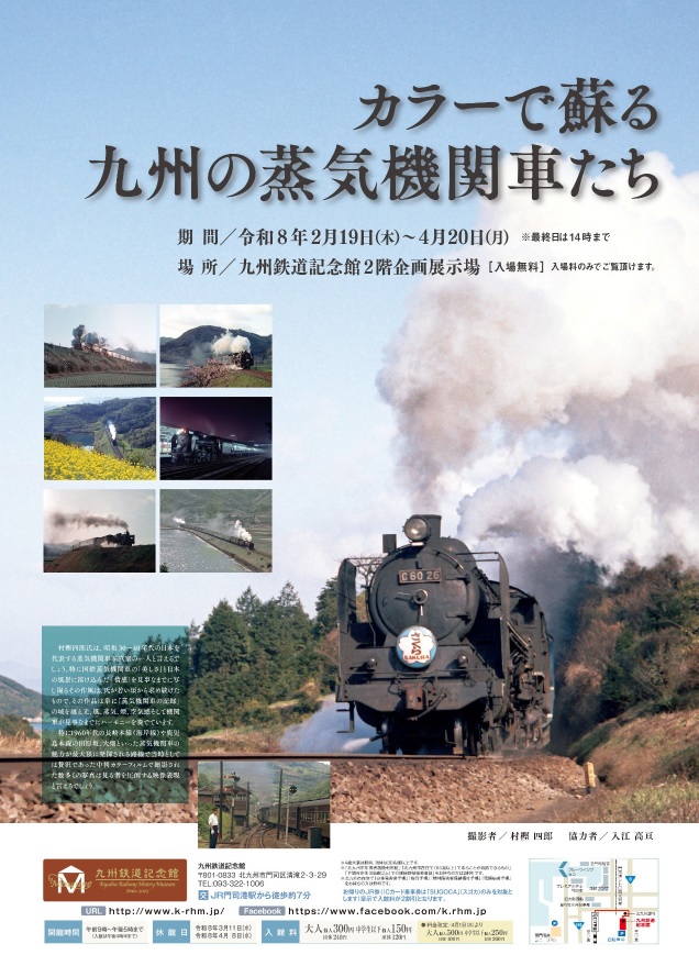 昭和30~40年代の輝かしい時代を彩った九州の蒸気機関車たちの「美しさ」と風景に溶け込んだ「情感」を見事なまでに写し撮った村樫四郎氏の作品約100点を展示します。当時としては贅沢であった中判カラーフィルムで撮影された数多くの写真は見る者を圧倒する映像表現と言えるでしょう。「カラーで蘇る九州の蒸気機関車たち」をどうぞ存分にお楽しみください。